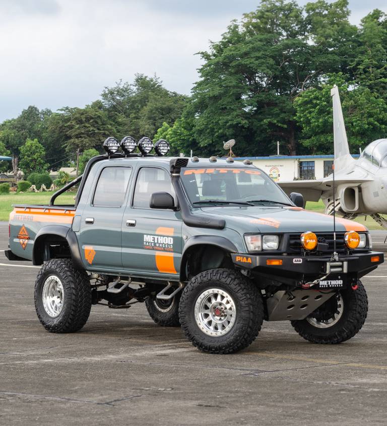 This classic Hilux was built by 199 Off-road House, one of the pioneers of the 4x4 industry in the Philippines. They equipped it with ARB front and rear steel bumpers, and a custom fabricated steel roll bar with four PIAA LED Sport Lamps. The teal blue color accented with orange livery is a classic yet fresh look for the Concept X Hilux. The slogan "every inch a Hilux" is embodied by this work horse. The Machine polished 17" 101 Beadlocks from Method Race Wheels wrapped with Nitto Trail Grapplers make it ready for any adventure.